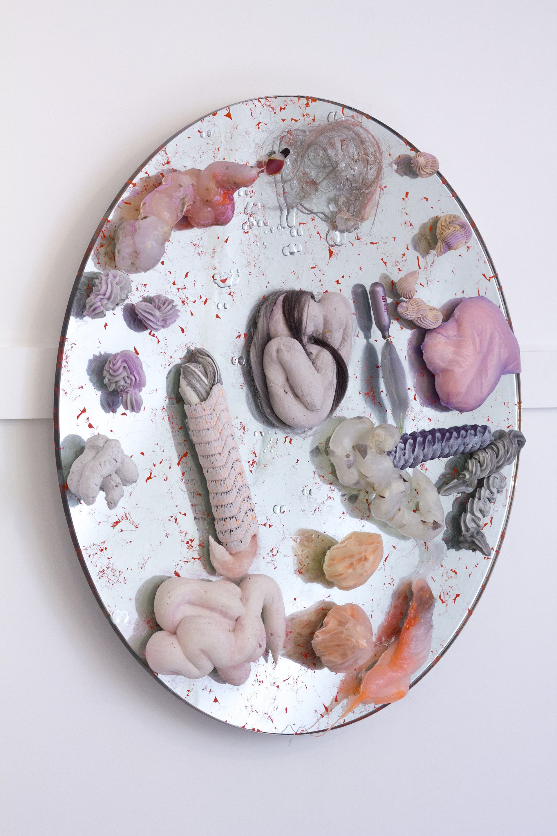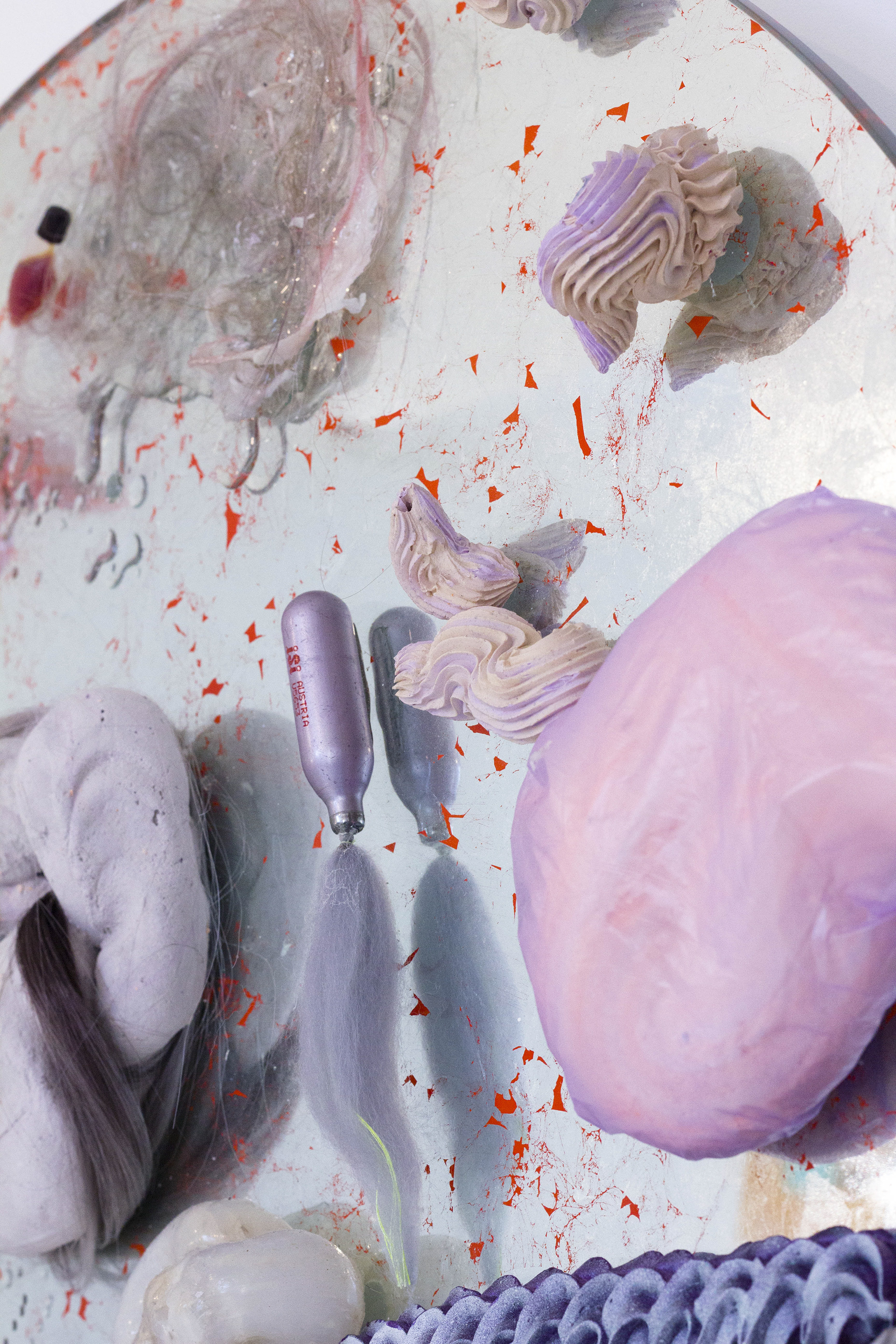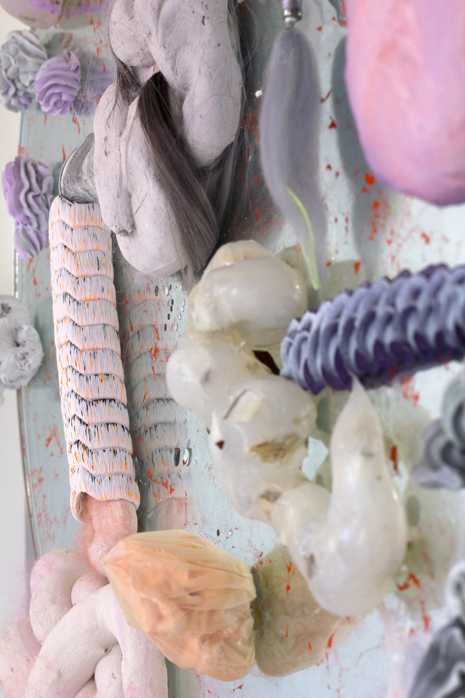 Glass, silver leaf, paint, plaster, decorators caulk, silicone, artificial hair, human hair, plastic bags, ceramic thread embroidery, silk, wool, resin, latex, soy sauce container, nitrous oxide canister, coconut, lemon, chives.